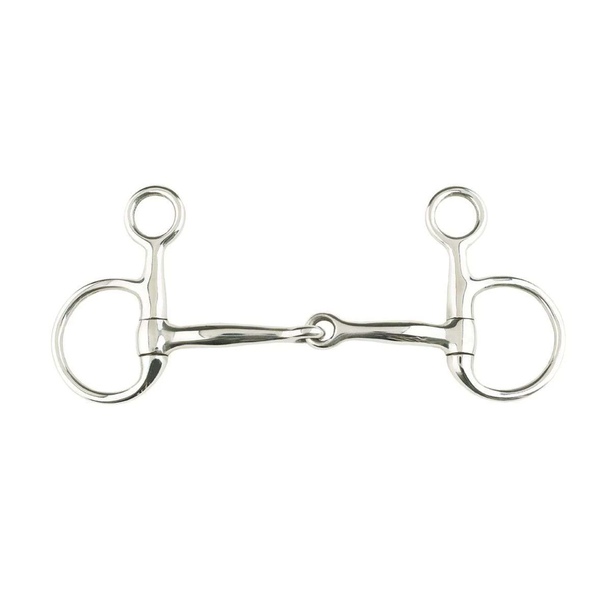 This Baucher bit has a standard jointed metal mouthpiece and a hanging cheek. The top ring attaches to the cheek pieces of the bridle and the larger ring to the reins. The bit provides just enough elevation and is ideal for the horse with a sensitive mouth.