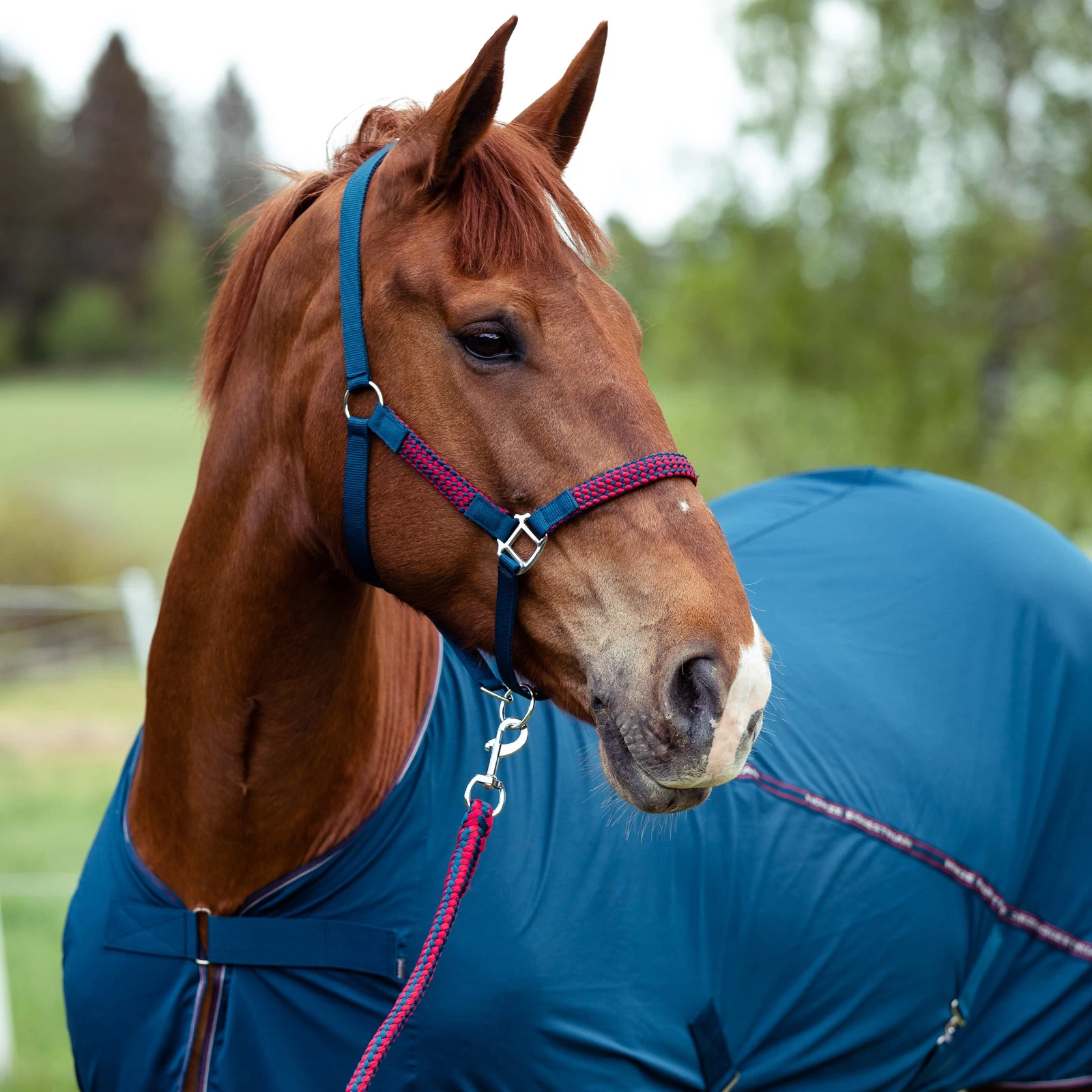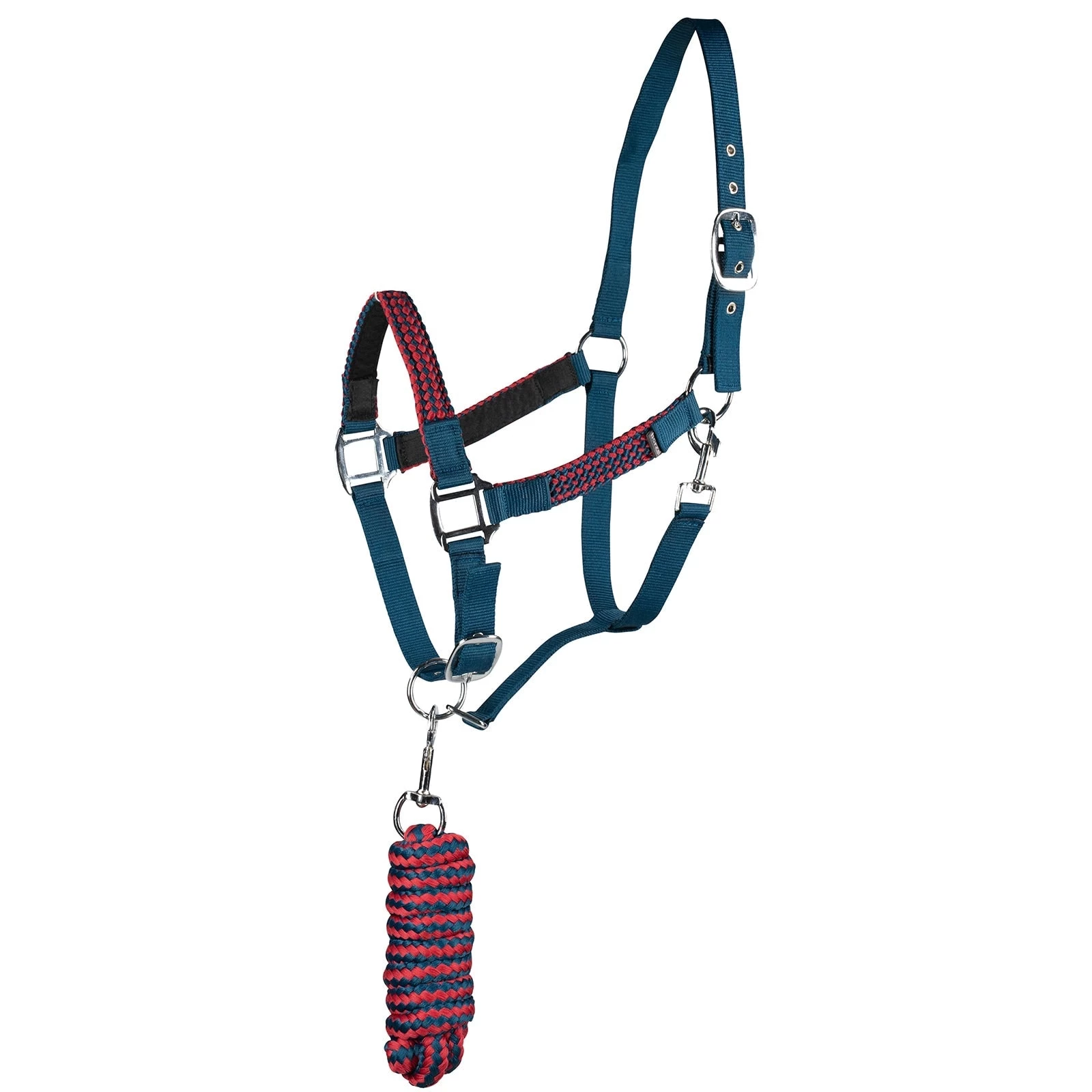 Braided cheeks and nose add a nice touch to this halter and lead set. The braided pattern matches the lead. Adjustable crown and nose allow you to find the perfect fit. 100% Polyester.