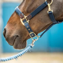 The gold-tone buckles provide added elegance. The nose and crown are lined with a soft, quick-dry lining and are fully adjustable. The throat latch clasp is an easy-to-use snap hook. The inside of the halter features the Crescendo Crest.