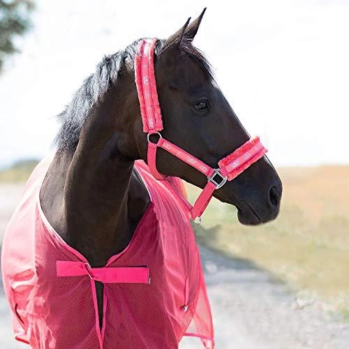 Halter & lead set from Horze with all the features you love. Faux fur lining adds plush comfort to this nice halte Soft cotton twist lead is included Crown and stirrup motif is printed on the designer webbing on the nose, cheek and crown. Adjustable nose and crown Snap closure at left cheek Silver-colored hardware Polyester & Cotton