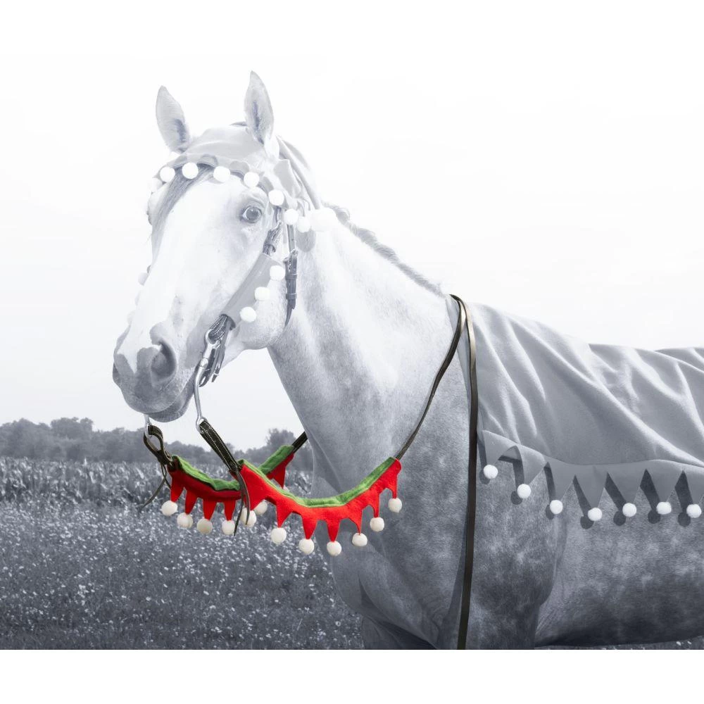 Show your holiday spirit with these green and red felt rein covers. The white fleece pompoms make these an eye-catcher. Great for parades, clubs, pony rides, costume classes, and Christmas photos. Attaches with ‘quick grip’ fasteners. These rein covers fit most English or Western tack. Matching items sold separately.