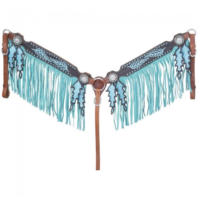 The Keely collection features turquoise and cream leaf embroidery on dark brown softie leather with turquoise crystal dots accents, and silver conchos with iridescent and turquoise swarovski crystals. Softie brown leather leaves with embroidered turquoise and cream leaves and turquoise fringe compliment the breastcollar. Medium oil.