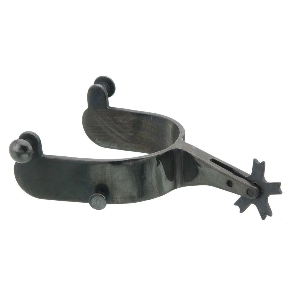 Outstanding handsome spurs designed to take the rugged wear of the rodeo. Finished in gun metal blue steel for extra strength and durability. Solid buttons and 1″ band. Bull/Bareback Combination Spurs. 22 1/2 degrees offset. 2 1/4″ shank and 5pt rowel.