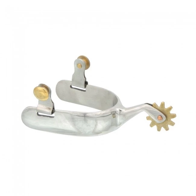 Stainless steel, 1″ oval shaped heel band, 2 1/8″ shank, 10 point 1 1/4″ rowel. Brass buttons and rowel.