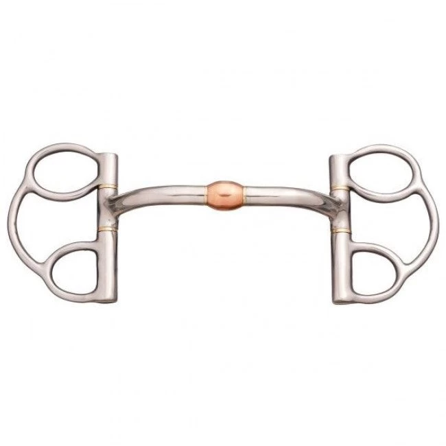 Chrome plated with inlaid copper mouth and copper roller. A gentle, pinch free mouthpiece that extends beyond the horse’s lips for better communication, plenty of tongue relief, and resistance free action cross the tongue, bars, and lips. Flush brass fittings in the pinchless mouthpiece.Dee and Fits 4 1/2” to 5 1/2” mouths.