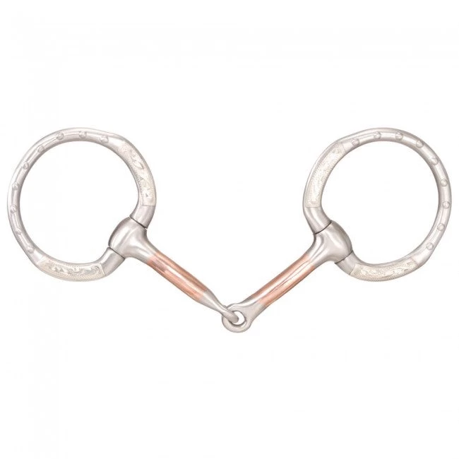 Engraved silver eggbutt rings with 5” copper snaffle mouth.