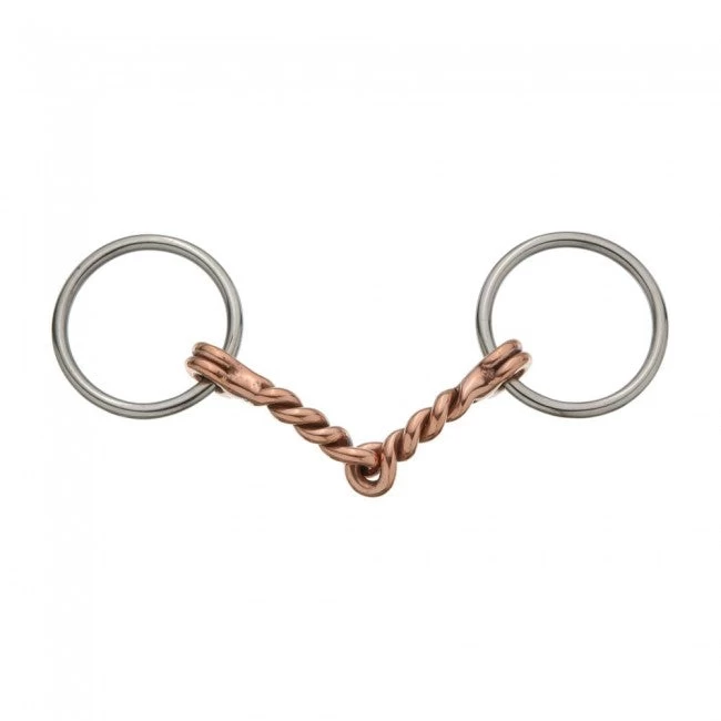 2″ stainless steel rings. Copper twisted wire snaffle mouth.