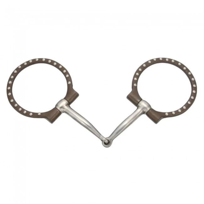 Very smooth pinchless bit with 3″ dee rings and silver dots on antique brown finish. 5″ SI snaffle mouth with inlaid copper. Good for a horse lugging on the bit.