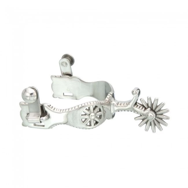 Flashy style stainless steel show spurs with handsome etched edges and inlaid rowel. Free swinging buttons, 1 3/4″ shank with chap guard and 14 point show rowel.