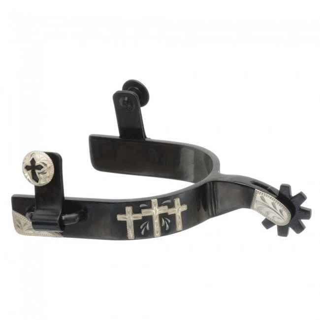 Black steel spurs with 8 point rowel features 3 engraved silver crosses.