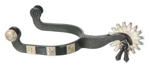 Sleek black steel or antique brown spurs with silver bars on 1/2” oval band. 16 pt chrom rowel and jingle bobs.