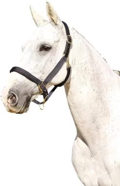 Made from quality leather Stylish headcollar with web accents on the cheek and noseband Full crown with buckles on both sides for easy adjustment, buckle under the nose with quick clip throat snap Includes brass plated buckles Matching lead available.