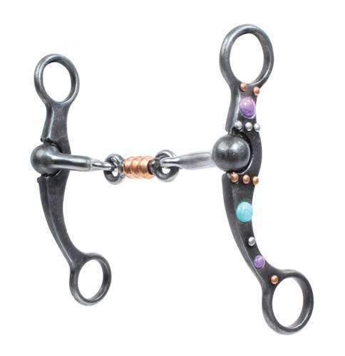 This weighted cheek allows for more control and added poll pressure while maintaining clean lateral movement. The cheek pieces feature decorative silver, copper and colored stone designs. Dog bone mouthpiece.