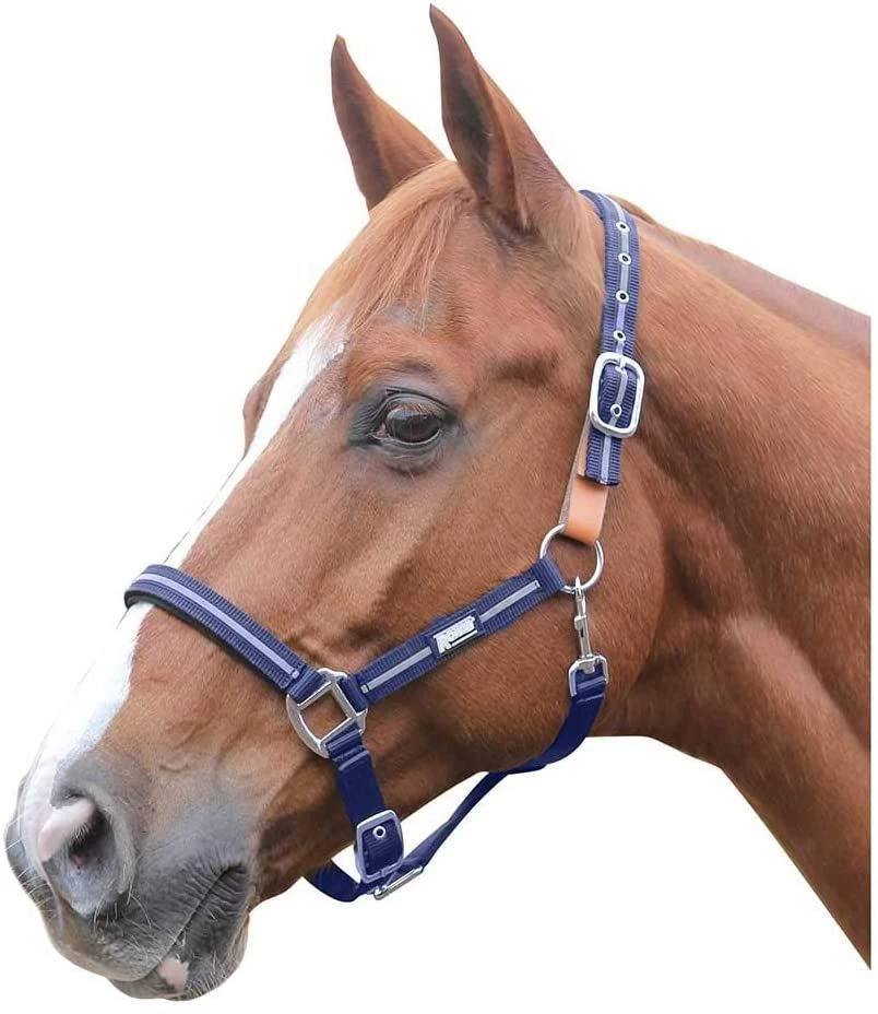The Roma Reflective Breakaway Halter improves your horse’s visibility and can help you spot him at night. With reflective strips on its front facing straps, this halter is great to use when turning your horse out at night. It’s also excellent to leave on when you’re riding or hand walking your horse by a road in poor visibility, as it can help to make your horse more noticeable to drivers. The Roma Reflective Breakaway Halter offers the strength and durability of a nylon halter, but its breakaway design means additional safety. Whereas a standard nylon halter will not break and should not be left on a horse that is turned out, this halter includes a leather breakaway link on its crown. In an emergency the leather link will break, freeing the horse and helping to prevent serious injury. This quality halter features buckles on the crownpiece and noseband, meaning that it is fully adjustable for the best fit for your horse. All of the buckle holes are reinforced with metal grommets to prevent fraying and stretching. A throatlatch clip makes fastening this halter fast and easy.
