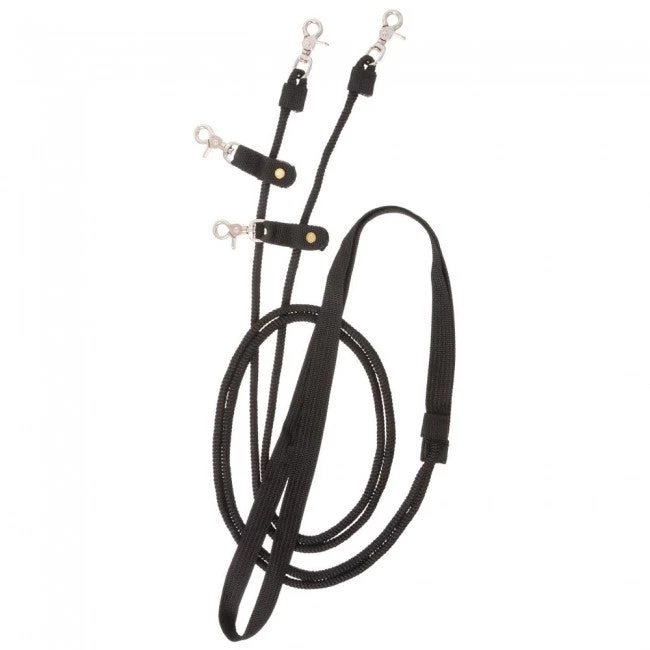 These draw reins are made from lightweight nylon cord and feature a flat cotton web center for comfortable grip. The pulley design allows these reins to slide freely, helping to develop a light mouth and proper headset when training green horses. Complete with quality scissor snaps for easy attachment to bit and saddle. 1/2″ x 7 1/2′ This is a more advanced piece of training equipment, seek out a trusted equine professional for guidance and education on proper use.