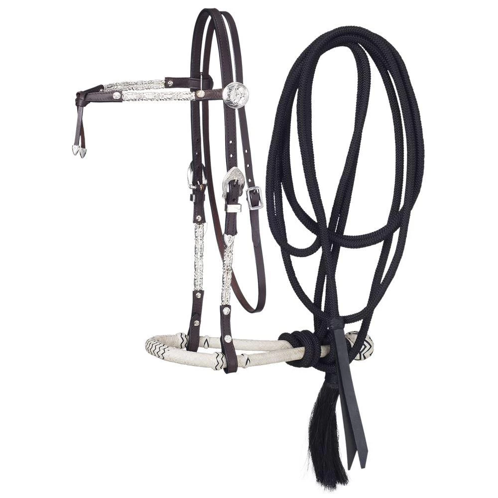 Fine quality 5/8” rawhide core show bosal with 1/2” braided nylon cord mecate rein. Show quality headstall highlighted with bright Inca silver ferrules and trim. Light oil and dark oil.