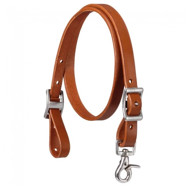 This tie down is made from single-ply latigo leather with a swivel snap at one end and a conway buckle at the other. When attached to a noseband and girth, this piece of equipment places pressure on the nose and/or poll when the horse raises his head. 3/4″ wide x 40″ long
