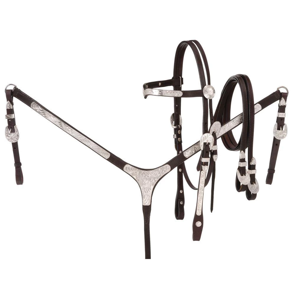 Double sewn on choice leather highlighted with striking bright Inca silver trim. Complete with silver buckle end reins and breastcollar.