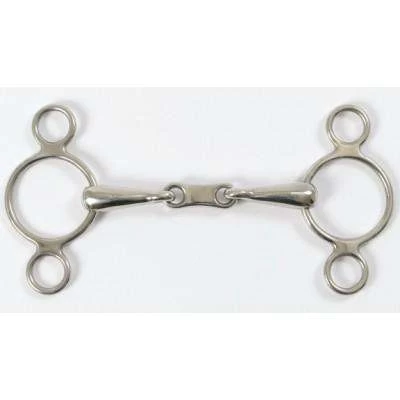The Shires 2 Ring French Link Elevator Gag is much less expensive than German models and is often needed by three day eventers. Gag bits for horses typically come in two models: the two ring gag and the three-ring gag. This model is called a 2 ring elevator bit because there are two places to attach your reins. You can put them on the main ring (making it a gag snaffle bit), or on the bottom ring, which will give you the leverage that defines this type of gag bit. The 2 ring gag bit is not nearly as severe and does not provide as much leverage as the 3 ring model, which is typically used only on very strong horses.