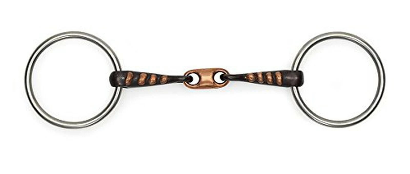 With a sweet iron mouthpiece designed to produce a sweet taste and encourage salivation as it oxidizes. The copper lozenge and loose ring cheeks make this a relatively mild training bit.