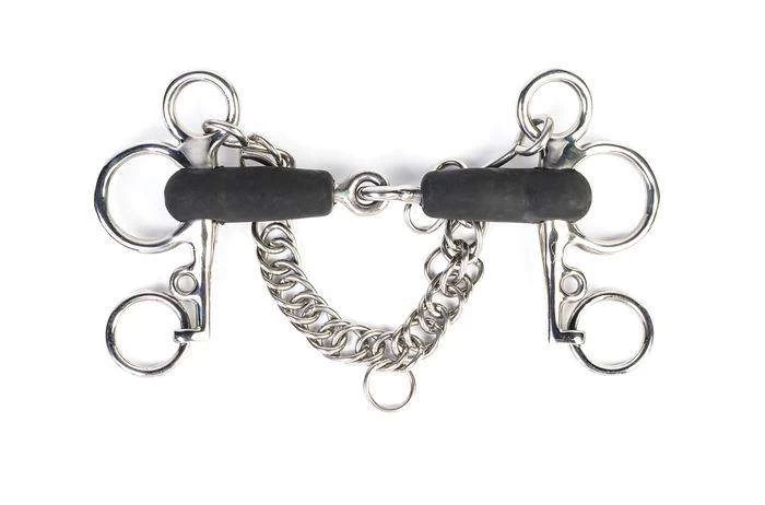 The rubber-covered mouthpiece on this jointed Pelham makes it thicker and softer on the horse’s mouth. Has a shorter and more mild shank. Can be used with two reins or bit converters.