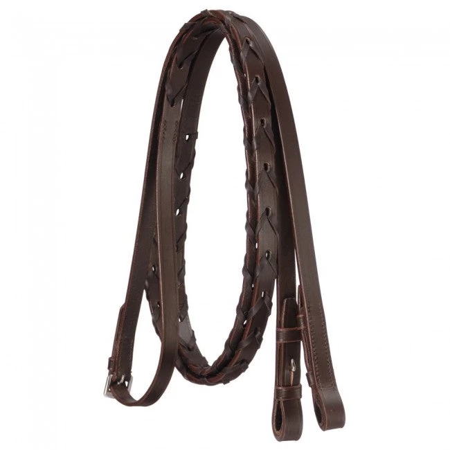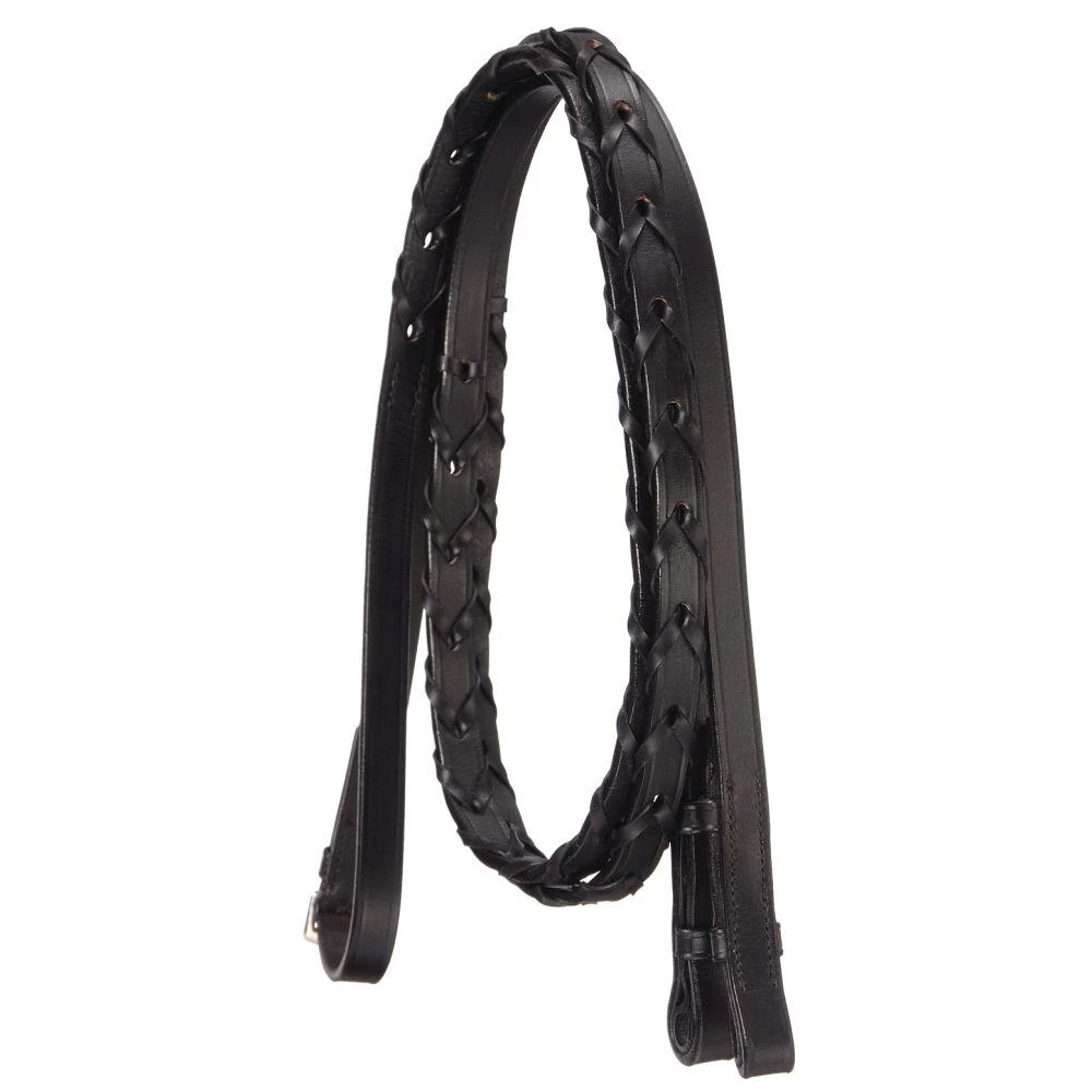 Silver Fox Laced Reins These quality reins feature hand-woven leather lacing with hook studs. Item Specifications: Size: 5/8″ wide, 55″ long