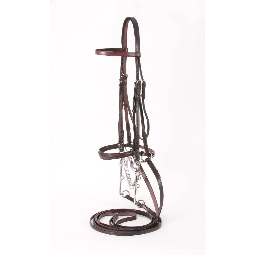 Made of standard quality leather. The ribbon like reins allow the most sensitive contact with the mouth on the horse. Complete with stitched show caveson.
