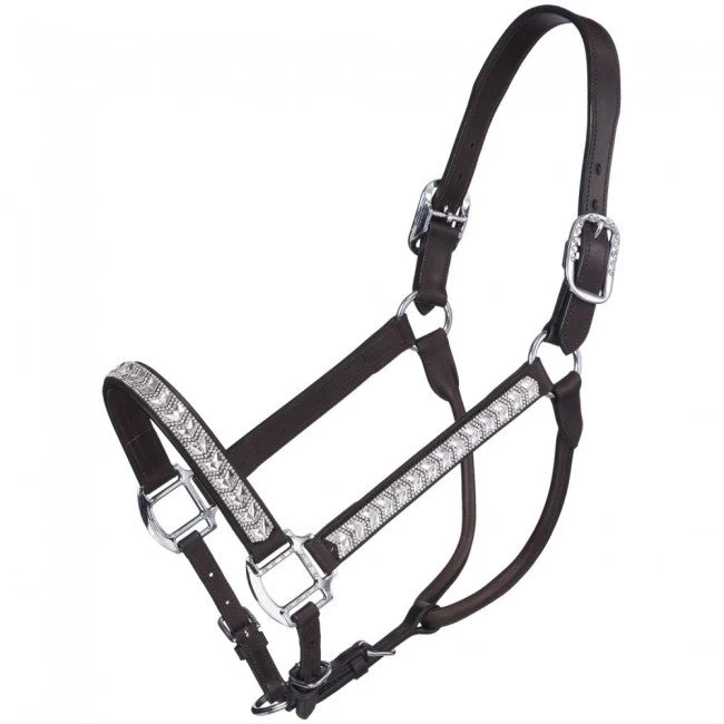 Get seen in the show ring with this stand out halter featuring crystal chevron pattern on nose and cheeks. Made of premium bridle leather, doubled and stitched throughout for durability. Five points of adjustability to get the best possible fit to show off your horse’s head. Complete with leather lead with chain.