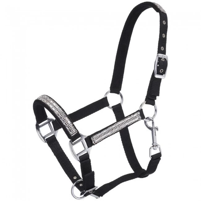 Fully adjustable nylon halter with brushed nickel hardware. Crystal accents on cheeks, crown, and nose. Features an adjustable nose and crown with snap at cheek.