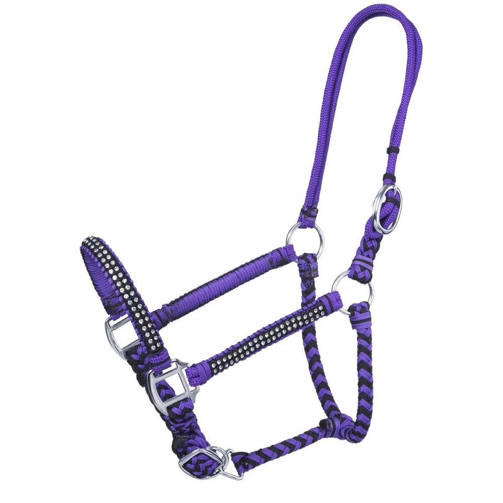 Braided cord halter has an adjustable nose and rope crown with buckle adjustment. Features crystal accents on nose and cheeks.