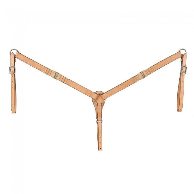 Premium cowhide breastcollar features natural rawhide design with black accents. Tie bit ends.
