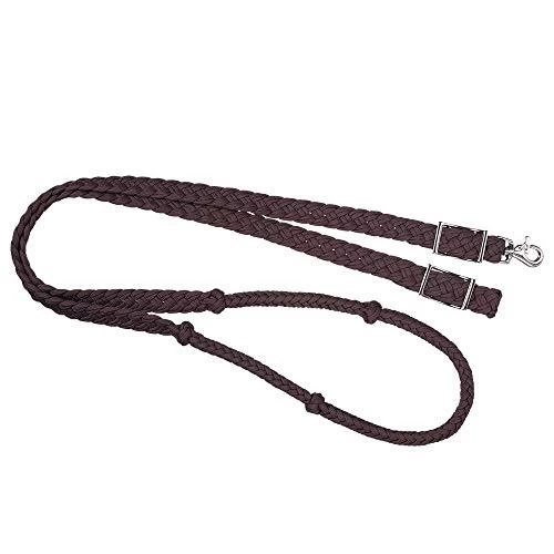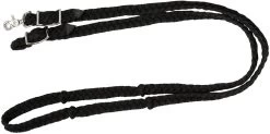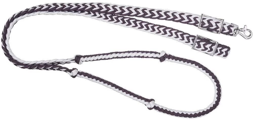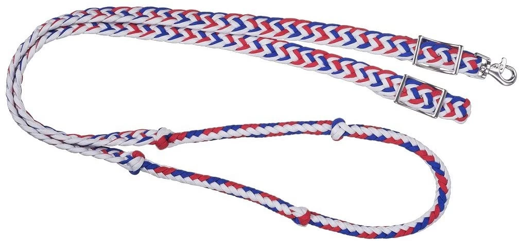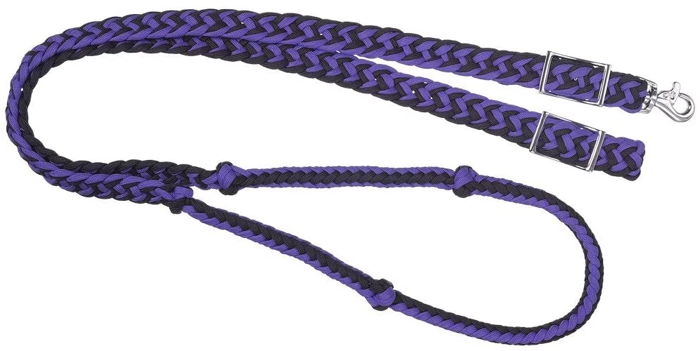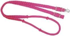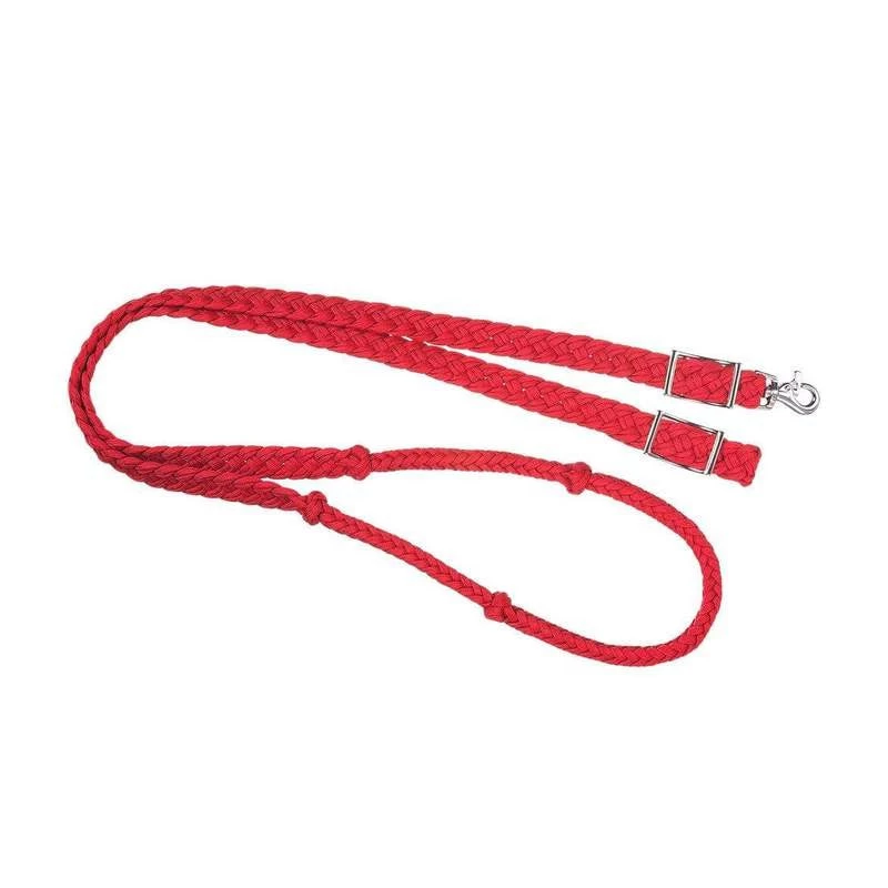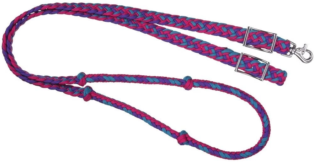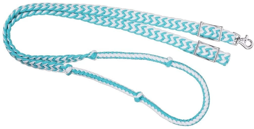 The “go-to” reins of contesting riders everywhere! Made from top-of-the-line poly cord, these roping reins have a comfortable and secure feel in the hands. The rolled woven top features four knots for precise control and better grip. Complete with conway buckle ends for adjusting the length to fit your unique horse and a single Triggerbull snap for easy leading. 1″ wide x 8′ long