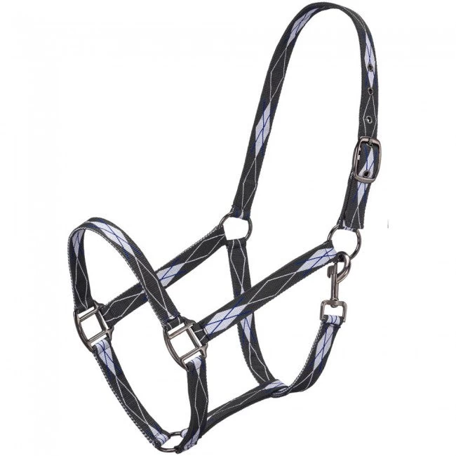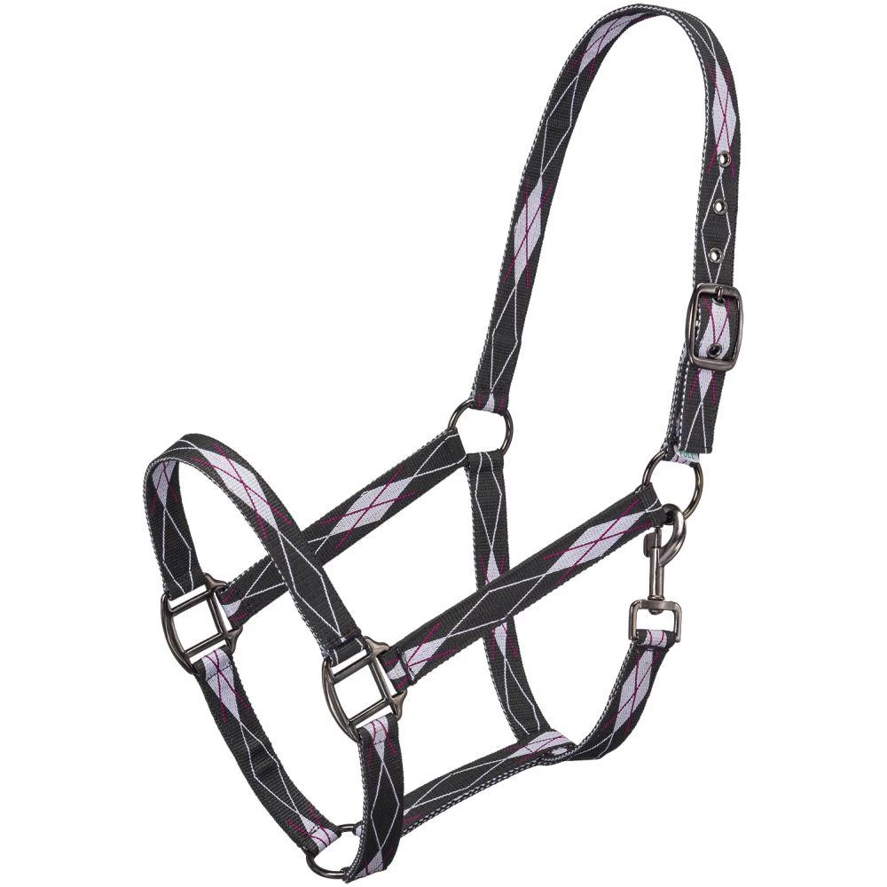 Strong nylon halter with fun diamond X design. Snap at throat and grommeted holes for longer wear. Gun metal hardware.