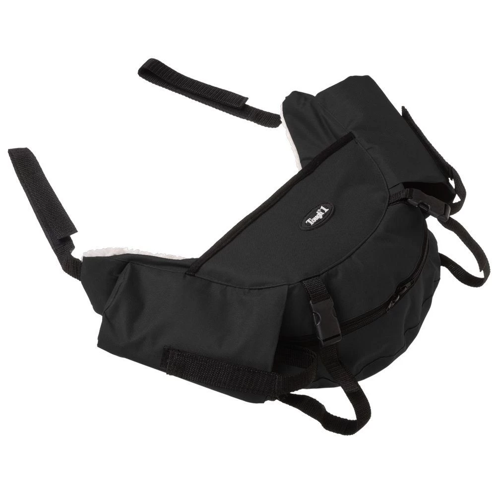 Heavy denier nylon saddle bag with two water bottle pockets. Zipper closure. Finally a good quality saddle bag for the english rider. Nylon straps for easy attachment. Fleece bottom, 32″ long, 2 water bottle holders.