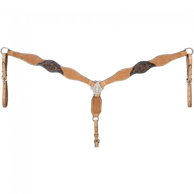 Premium cowhide flared breastcollar with light oil basket stamping accented with antique black floral tooling. Engraved center plate, stainless steel buckles & fully adjustable.