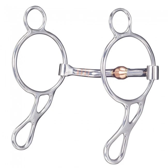 Stainless steel with inlaid copper mouth and copper roller. A gentle, pinch free mouthpiece that extends beyond the horse’s lips for better communication, plenty of tongue relief and resistance free action across the tongue, bars and lips. Flush brass fittings in the pinchless mouthpiece and cheek pieces with smooth, independent action from side to side. Fits 4 ½” to 5 ½” mouths.