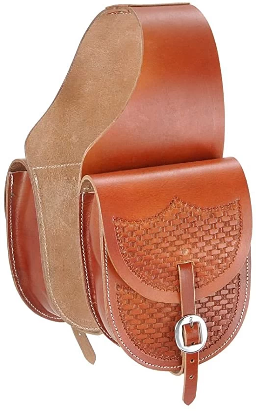 Quality leather with hand tooled basketweave stamp pattern. Great for short trips when you don’t need as many accessories. Fits full size saddles. 6 1/2″ x 9 1/2″ with 2 1/2″ gusset.