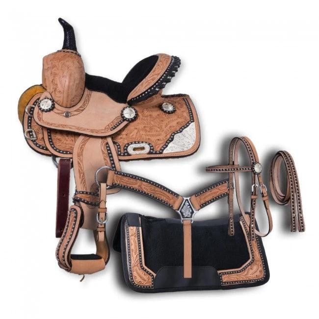 Package includes miniature 8″ Burn the Breeze saddle, browband headstall with split reins, breastcollar, neoprene waffle weave girth and saddle pad.