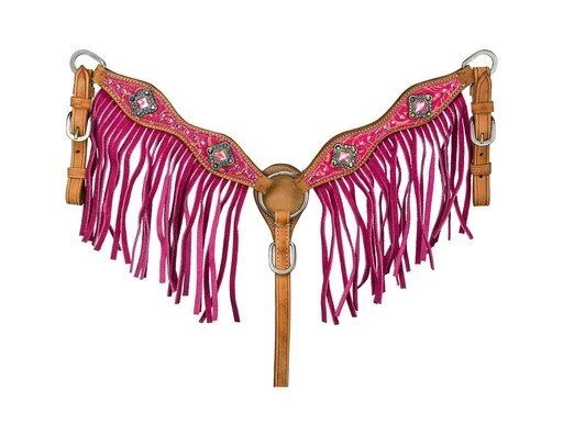 The mini azalea breastcollar features pink and gold floral print overlay with pink gems and pink fringe as accents. Silver conchos with iridescent Swarovski crystal and large pink gems complete the look.
