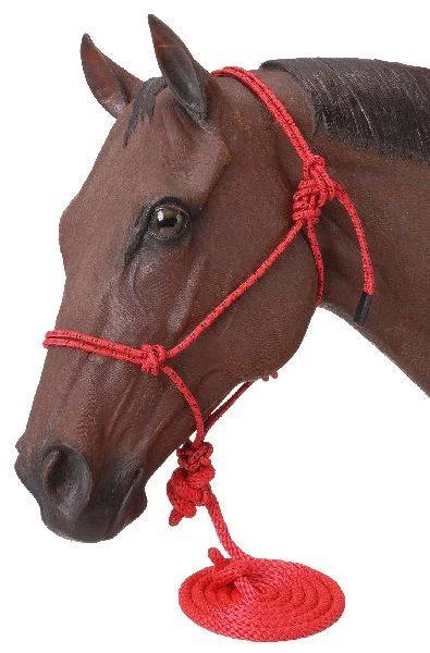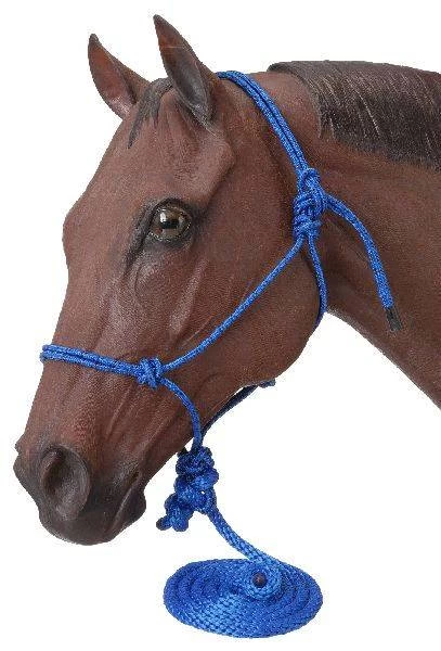Fully adjustable poly nylon rope halter complete with lead. Throat knot should touch the horse’s throatlatch, ropes from that knot to the crown should come up behind the jaw bone for proper fit.