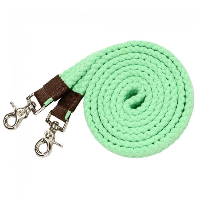 A very popular roping rein for western riders of any discipline! Made of natural super soft braided cotton these reins offer a lightweight, ultra-comfortable feel in the hand. The scissor snap bit ends are reinforced with nylon for extra strength to withstand everyday riding. 1″ wide x 7′ long