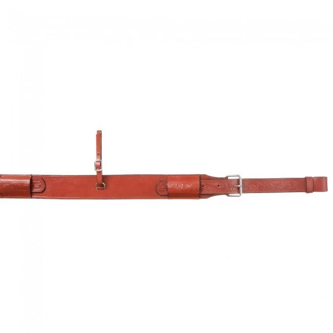 Affordable single ply, 3†wide body center with 1 3/4†billets. Made of heavy tooled leather and plated roller buckles.